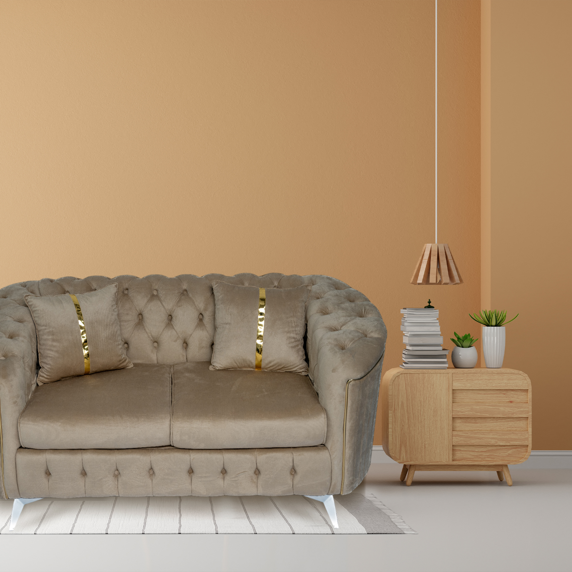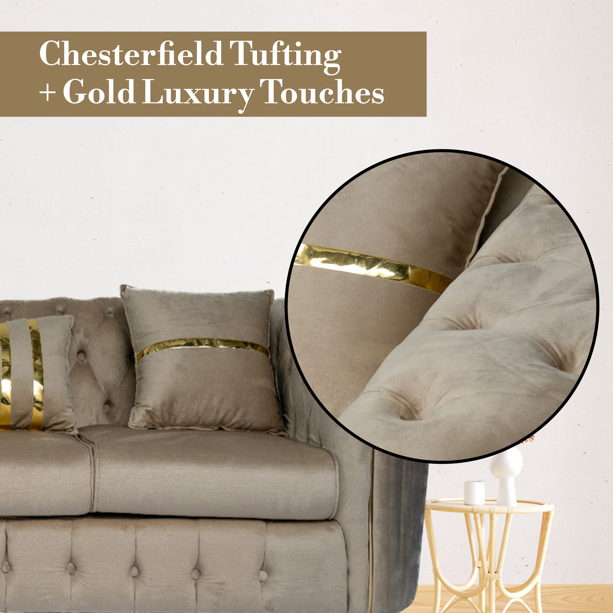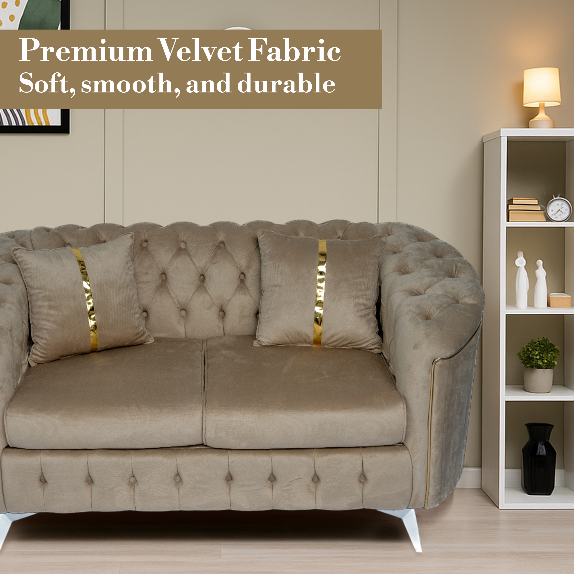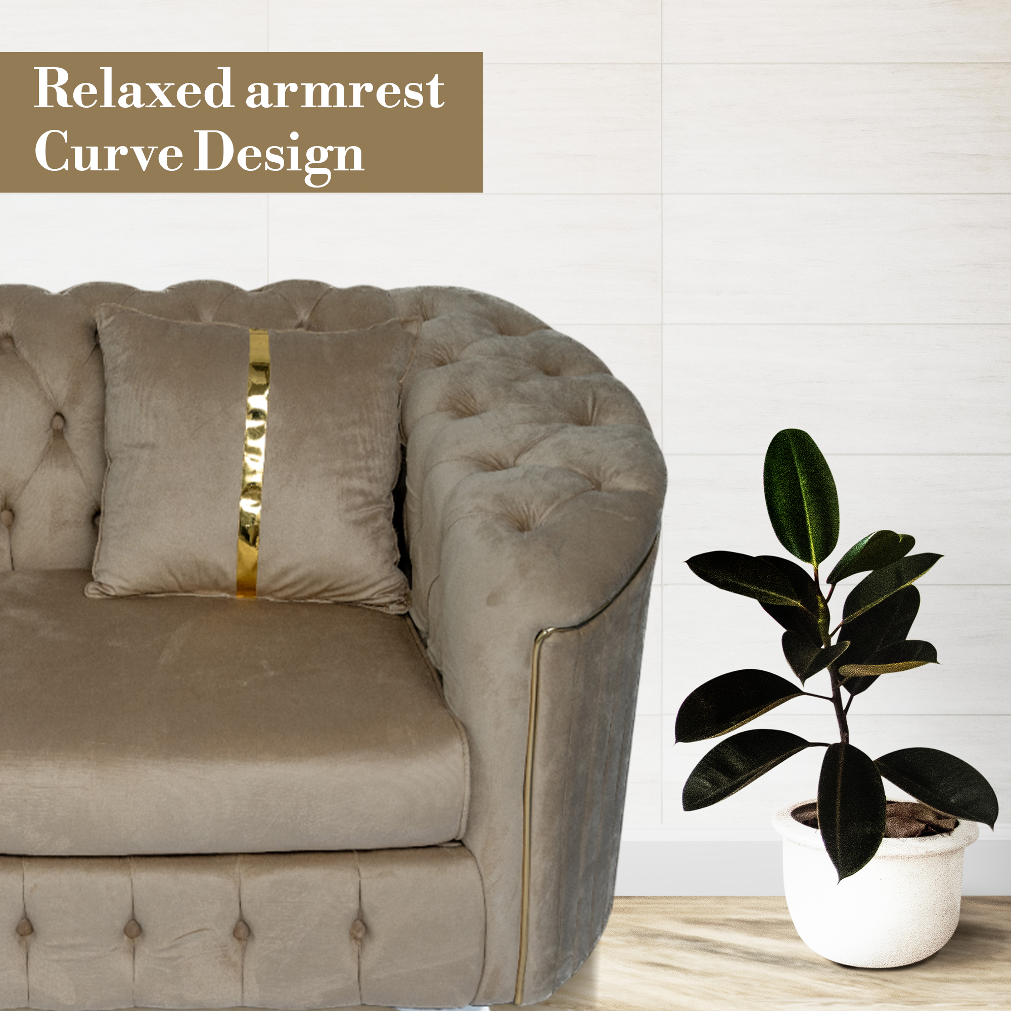 The signature deep button tufting covers the backrest and base, providing a rich, textured look. It features a unique curved armrest design that flows seamlessly into the back, offering a more relaxed and ergonomic seating experience. Each piece is detailed with vertical silver or gold piping and matching metallic legs, adding a touch of “jewelry” to your furniture. Whether you are hosting guests or curling up for a movie, the supportive high-resilience foam cushions ensure comfort that lasts for years.